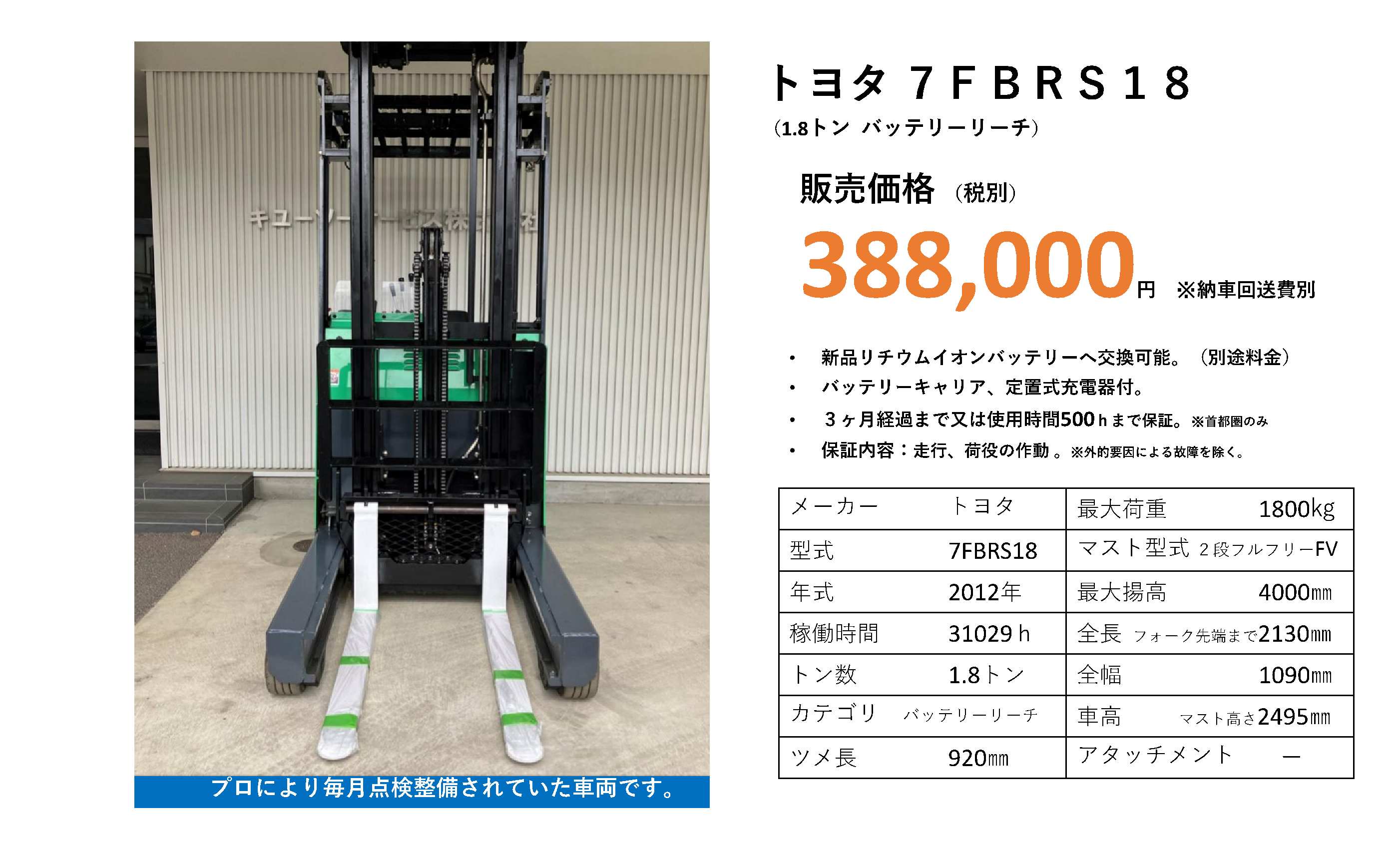 当社ではフォークリフトの中古車を販売しています。 今回のご紹介はこちら ★トヨタリーチフォークリフト中古車7FBRS18 <お問合せはこちらまで> キユーソーサービス株式会社 東京営業所 菅野宛 電話番号:080-2072-7661
